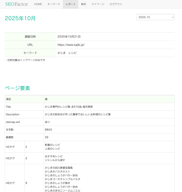 トップページの文字数や画像数、H1からH6とディスクリプションの内容、サイトマップの有無などのSEO構造の基本を確認できます。